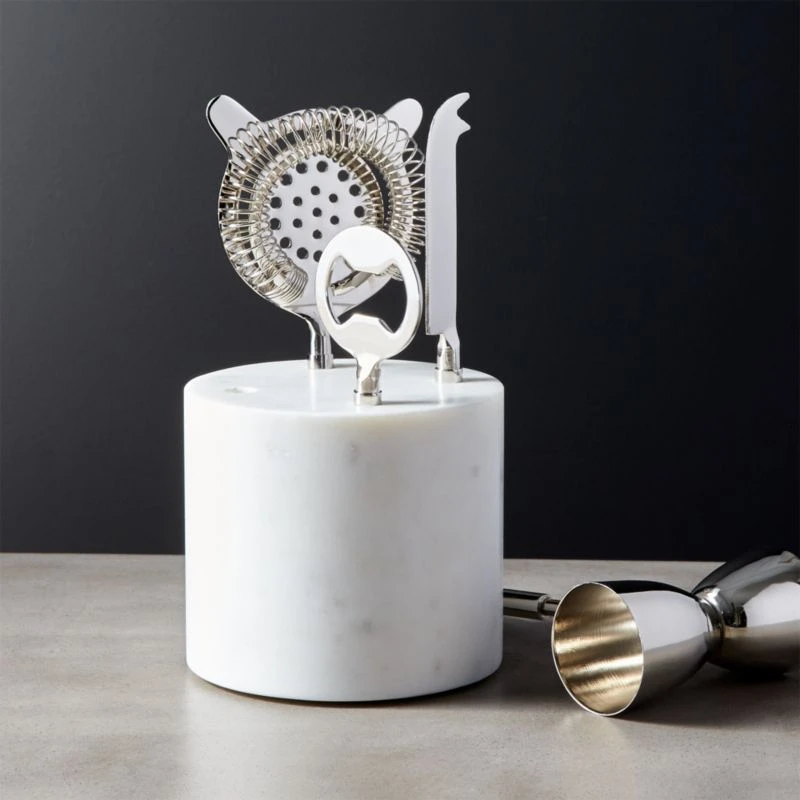 Handsome honed marble holds four essential stainless steel cocktail crafters: two-sided jigger (1 oz or 2), bottle opener, garnish knife and cocktail strainer. Bar tool set makes a great gift for the aspiring mixologist. CB2 exclusive.