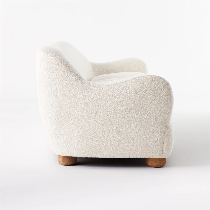 Boucle takes on cream-colored hues in loungeable sofa designed by Ross Cassidy. Bubbly in shape with rounded legs of solid bleached oak and an oversized silhouette made for spreading out. CB2 exclusive.