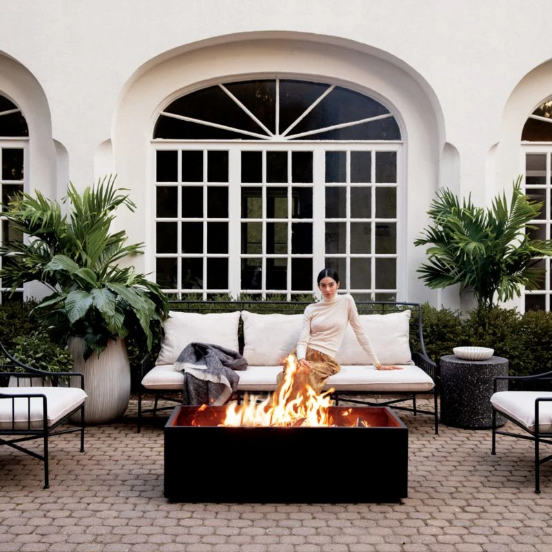 Designed by Mermelada Estudio, streamlined sofa evokes “the essence of French coastal living in the 1960’s.” Modern metal frame wears black matte powdercoat, topped with plush natural-colored seat and back cushions. Learn about Mermelada Estudio on our blog.