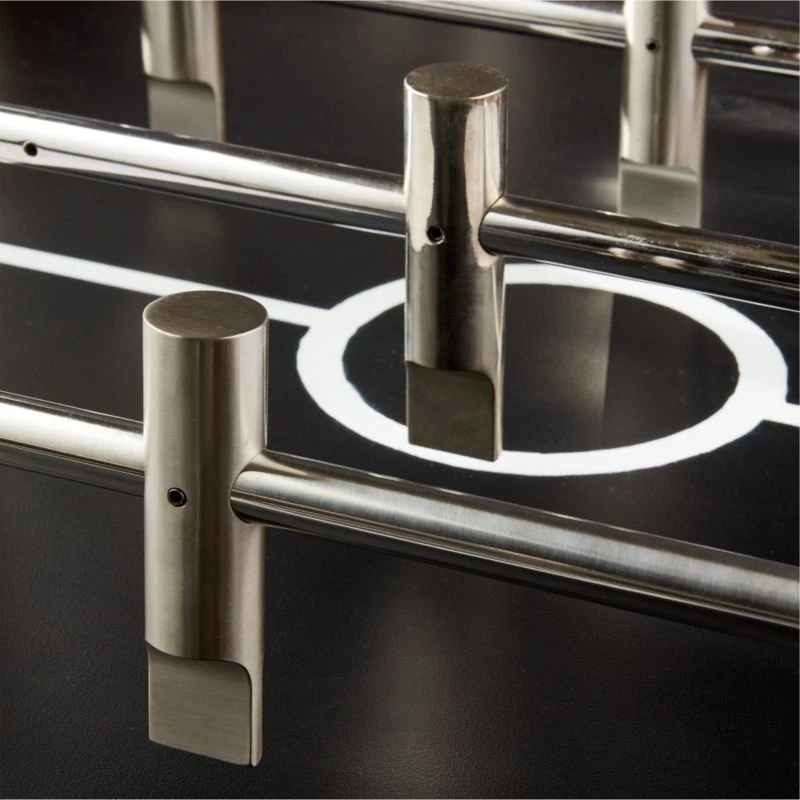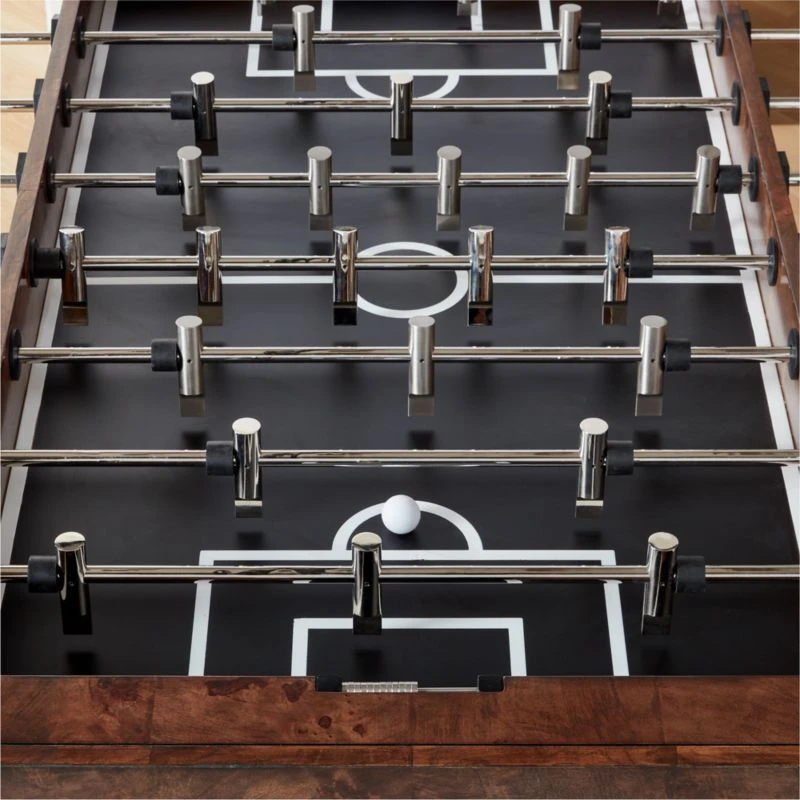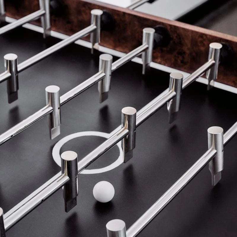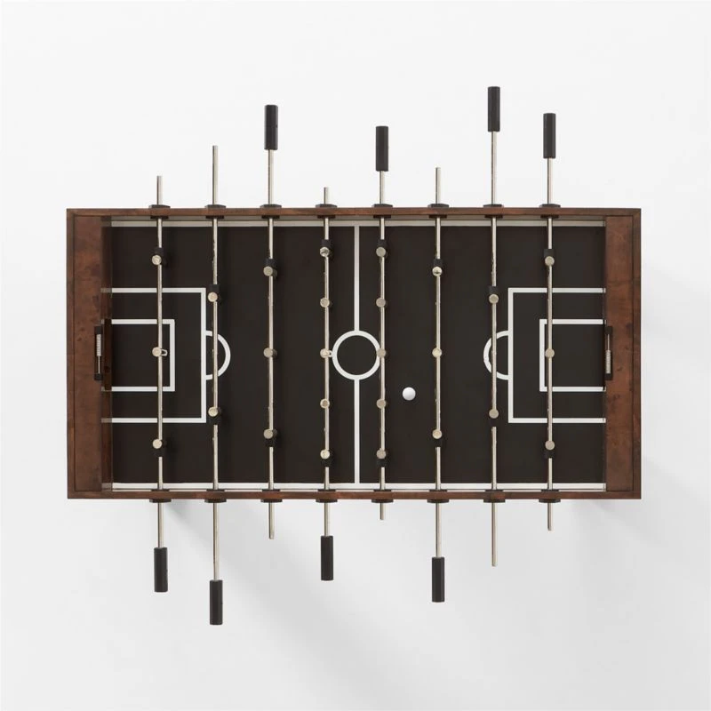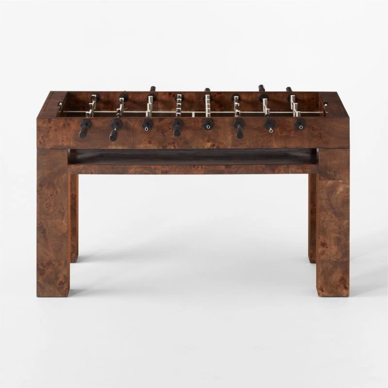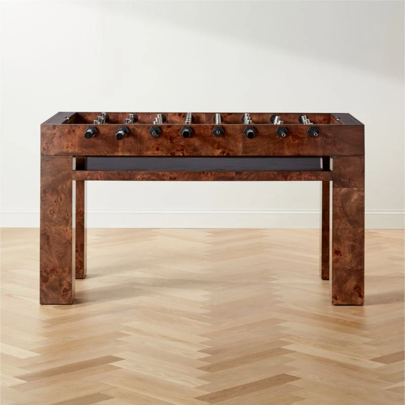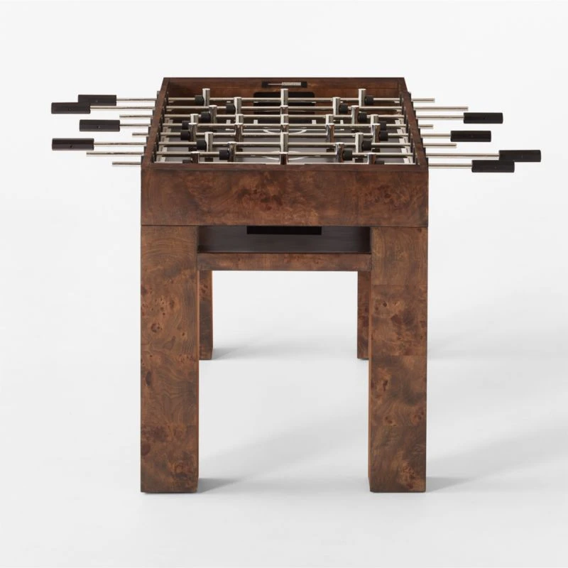 Designed by Barcelona-based Mermelada Estudio, rich burl wood plays beautifully with stainless steel details in this statement foosball table. Polished and brushed miniature players stand in position on stainless steel rods, hovering above a matte black field with contrasting white lines. CB2 exclusive.