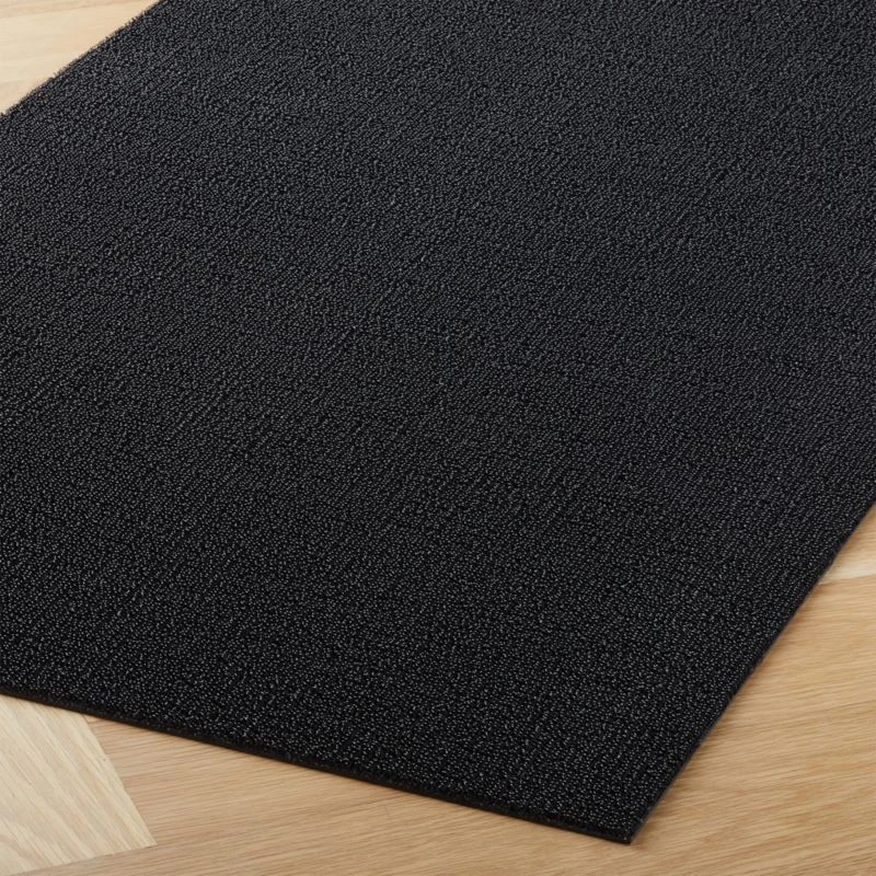 Modern black runner is tufted from durable yarns for a crush-proof texture that’s perfect for bathrooms, kitchens, patios and entryways. Hard-wearing, slip-resistant and so easy to clean. Just shake, vacuum or hose off outside.