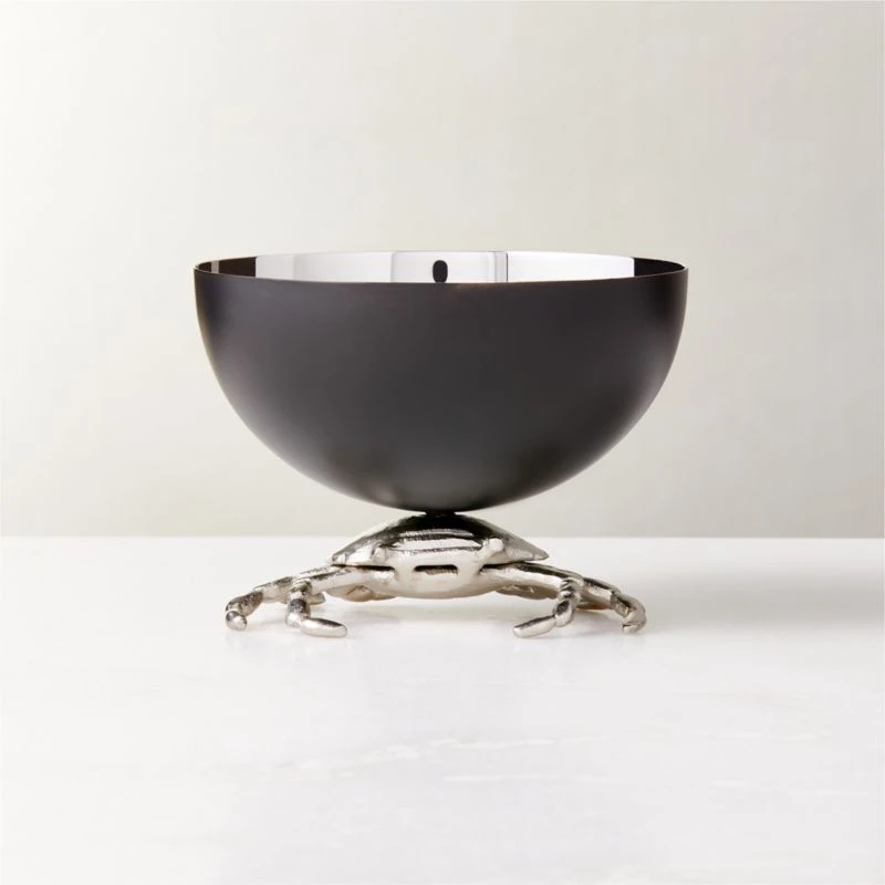 Polished stainless steel mini bowl rests on a solid cast aluminum crab for a bit of eclectic charm. Finished on the outside with a modern matte black powdercoat, mini bowl is perfect for snacks while entertaining. CB2 exclusive.