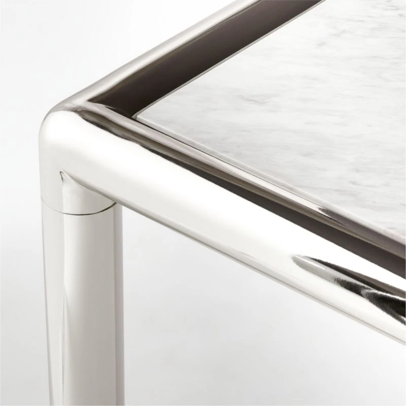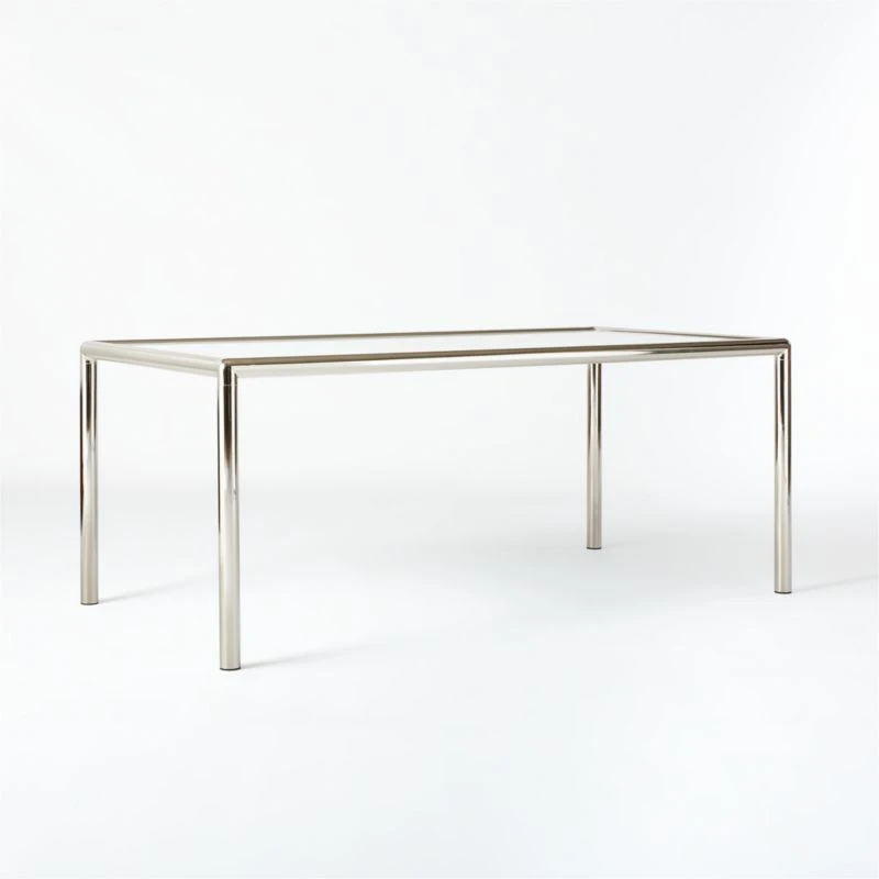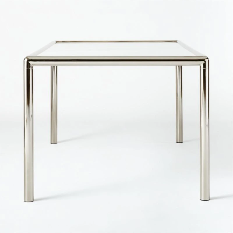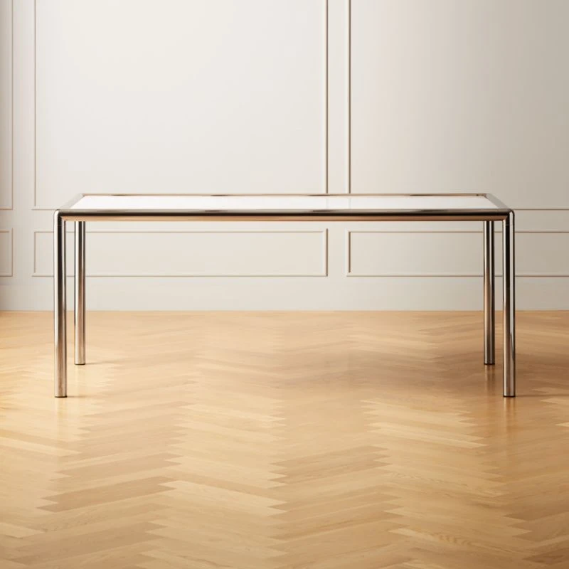 Organic marble top sits inside a polished nickel base for a minimalist dining table that keeps things simple but chic. We especially love it doubled as a desk/dining situation in smaller spaces. Easily converted, fits effortlessly with any style. CB2 exclusive.