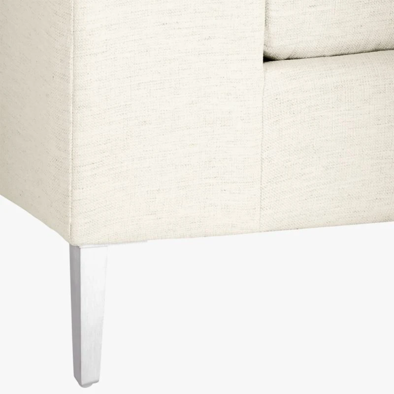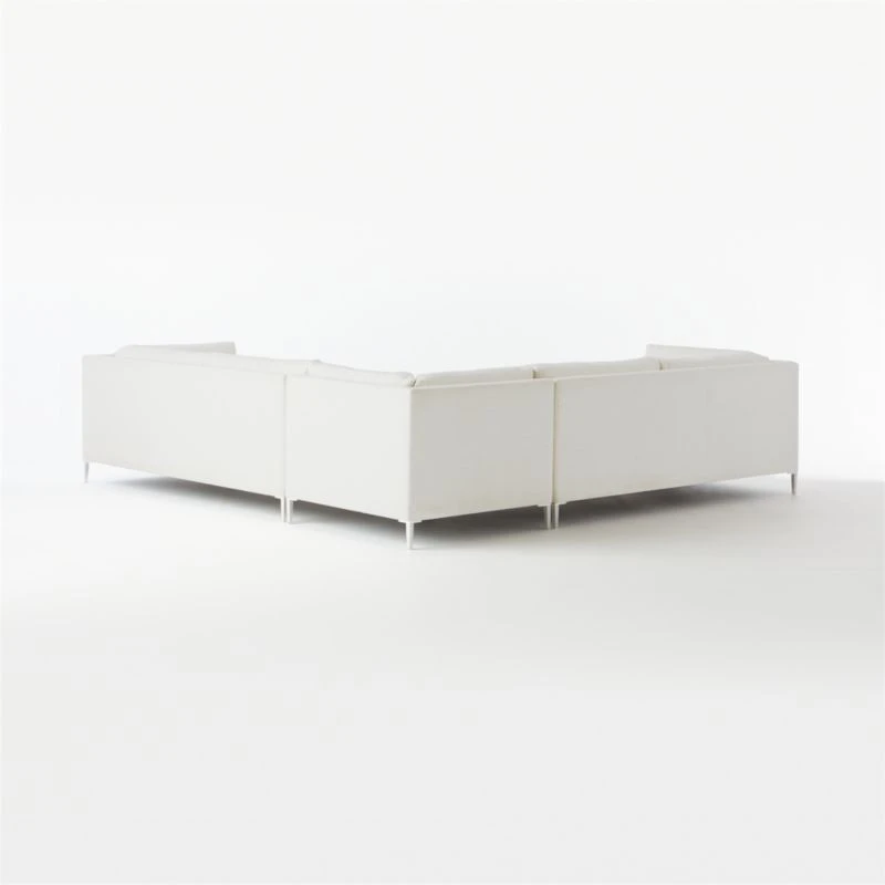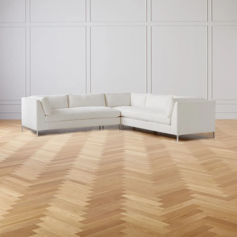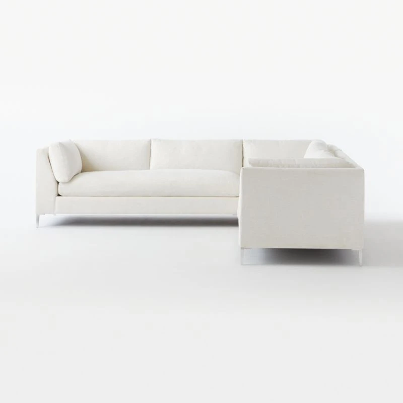 Generously scaled sofa provides extraordinary comfort. Tailored in snow white performance fabric, three-piece sectional sofa sits deep and spacious with the perfect balance of slouch and support. Cushions will continue to relax over time for a casual, comfortable look, all elevated on tapered legs that add a subtle gleam in brushed aluminum. Clean silhouette is accented by slightly angled arms that provide a supportive place to unwind. CB2 exclusive.