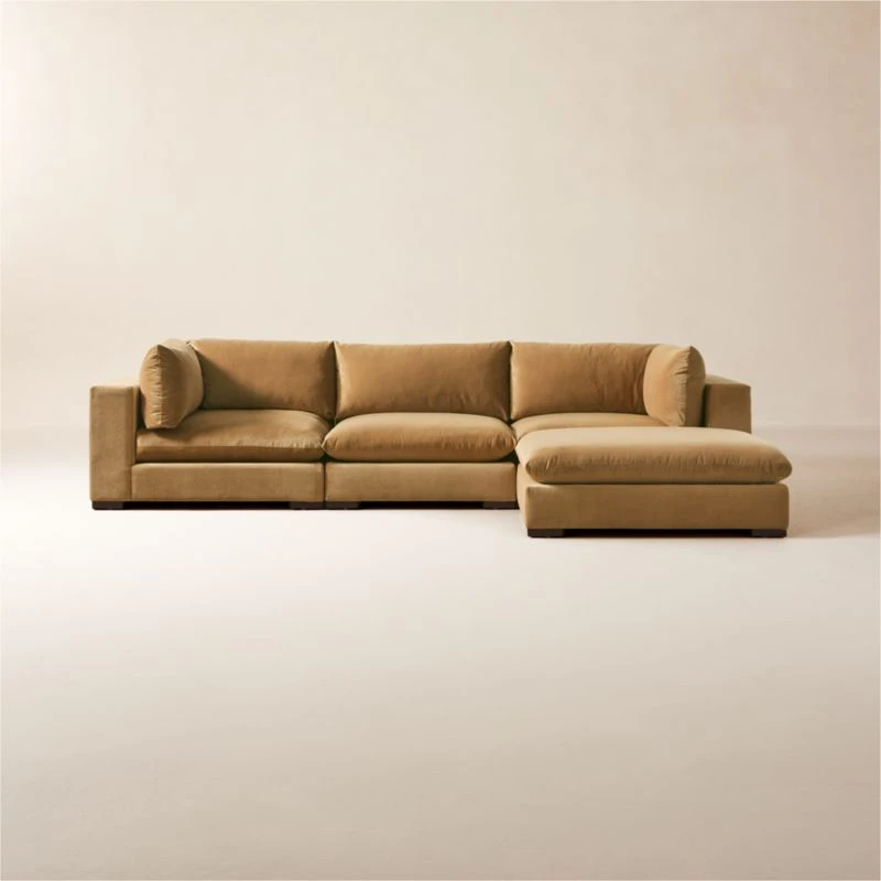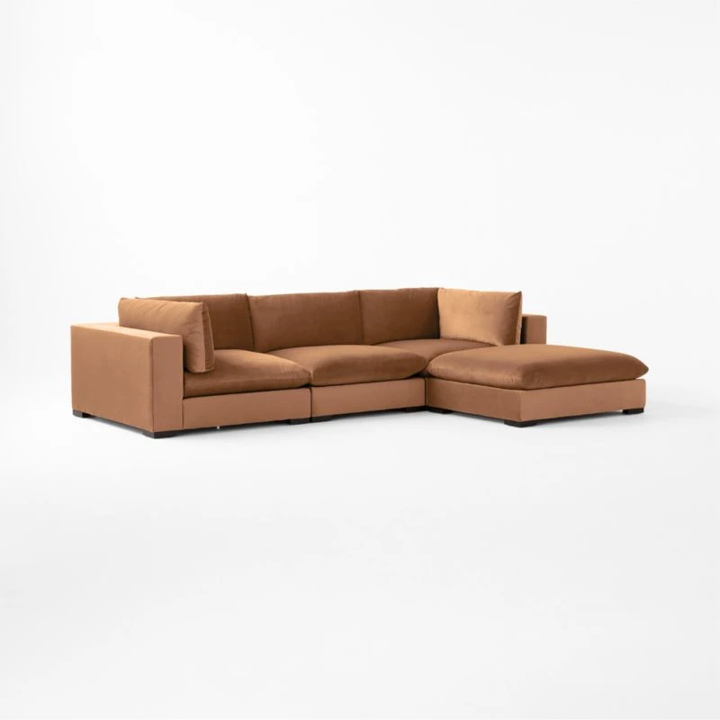 Upholstered in a rich copper performance velvet, large-scale sectional sits low to the ground for modern appeal. The plush silhouette features pillow-like detached cushions with broad armrests that can serve as a relaxed perch for socializing. Sectional pieces can be configured to suit your space. CB2 exclusive.