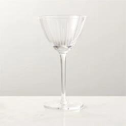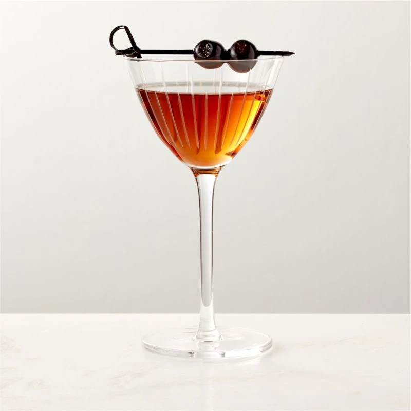 Handblown from clear soda lime glass, Nick and Nora cocktail glass features a gorgeous etched design cut by hand. Somewhere in between a coupe and a martini glass, the retro shape and delicate details are perfect for a Manhattan. CB2 exclusive.