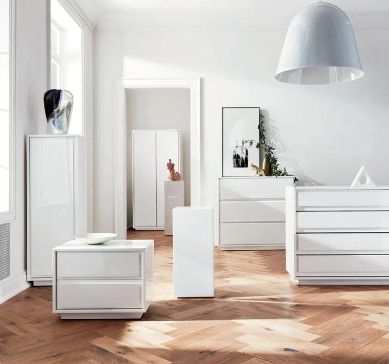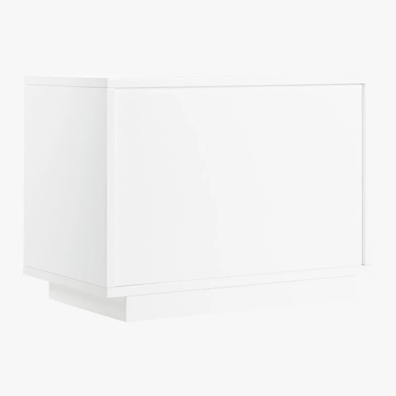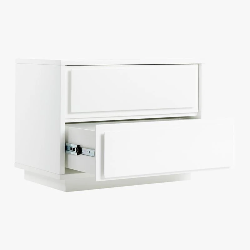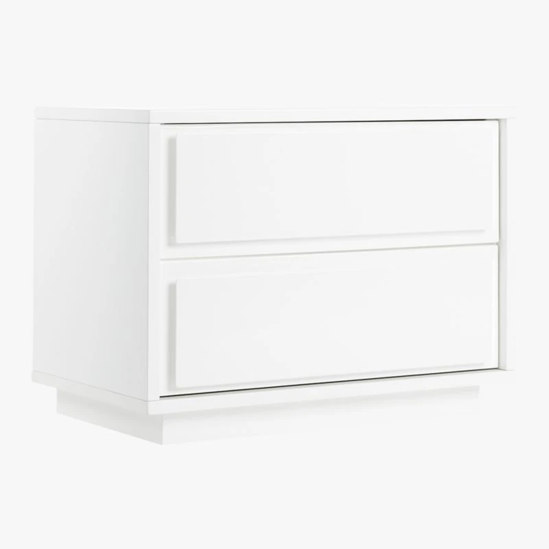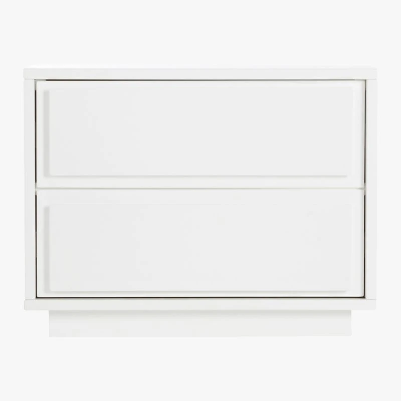 Minimal nightstand takes a modern turn in glossy white lacquer. Two roomy drawers cut a clean line with recessed drawer panels rather than traditional hardware. Slim plinth base keeps it sturdy and sleek. Learn about Mermelada Estudio on our blog. CB2 exclusive.