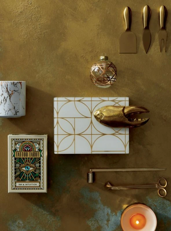 Small sculptural tools in a shiny gold finish add a bit of glam to the appetizer course. Trio of slicer, fork and knife make a great engagement, housewarming or host gift.