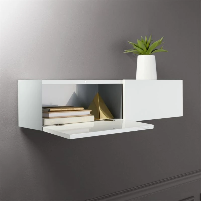 Slick hi-gloss brite white double doors flip to surprise grey powdercoated steel walls in a design by Diana Lu of Slate Design. White lacquered engineered wood with super-thin grey sides that hint at the interior. Use solo, stacked or ganged down the wall. Great storage solution to free up floor space in dining, entry, hallway, bath, bedroom. Learn about Diana Lu on our blog. hide n’ seek storage shelf is a CB2 exclusive.