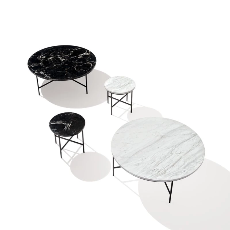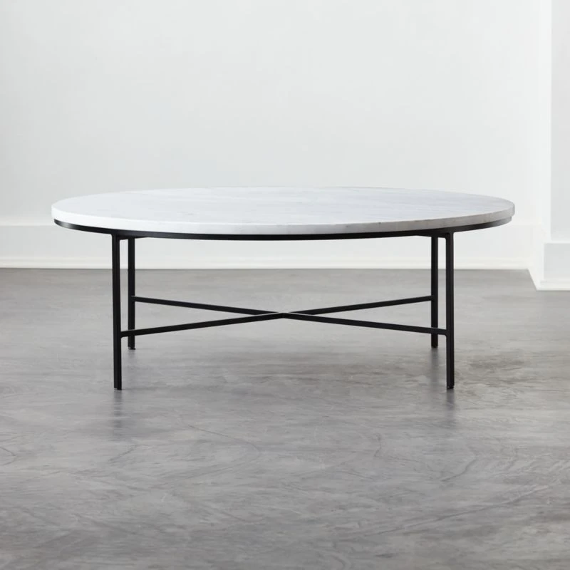 First designed in 1952, the Irwin Collection by Paul McCobb is stunning in its simplicity. Updated in honed white volakas veneered marble with a solid iron rod base and cap feet detail, coffee table showcases the attention to detail and quality typical of classic midcentury design. CB2 exclusive.