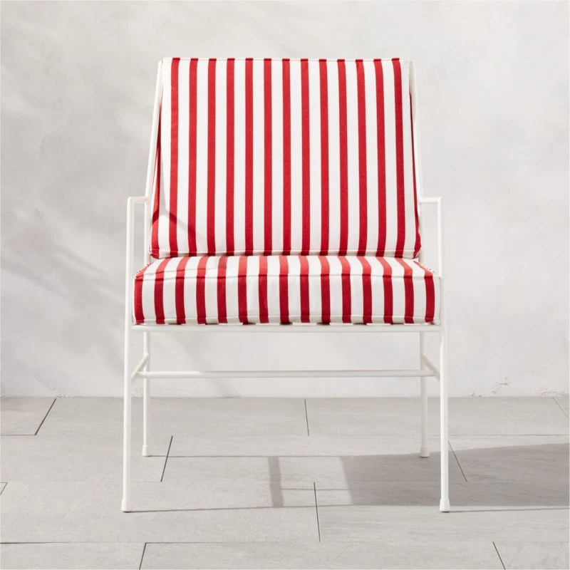 First introduced as part of Paul McCobb’s 1952 Pavilion Collection, outdoor lounge chair was designed to be durable, beautiful and easy to care for. Our reissue introduces bold red stripes in a weather-resistant Sunbrella ® performance fabric, evoking the glamour of a vintage resort on the French Riviera. The Pavilion Collection was featured in the June 1953 issue of House & Garden magazine in an original McCobb illustration, yet doesn’t feel at all out of place in a modern outdoor space or even an indoor living room. CB2 exclusive.