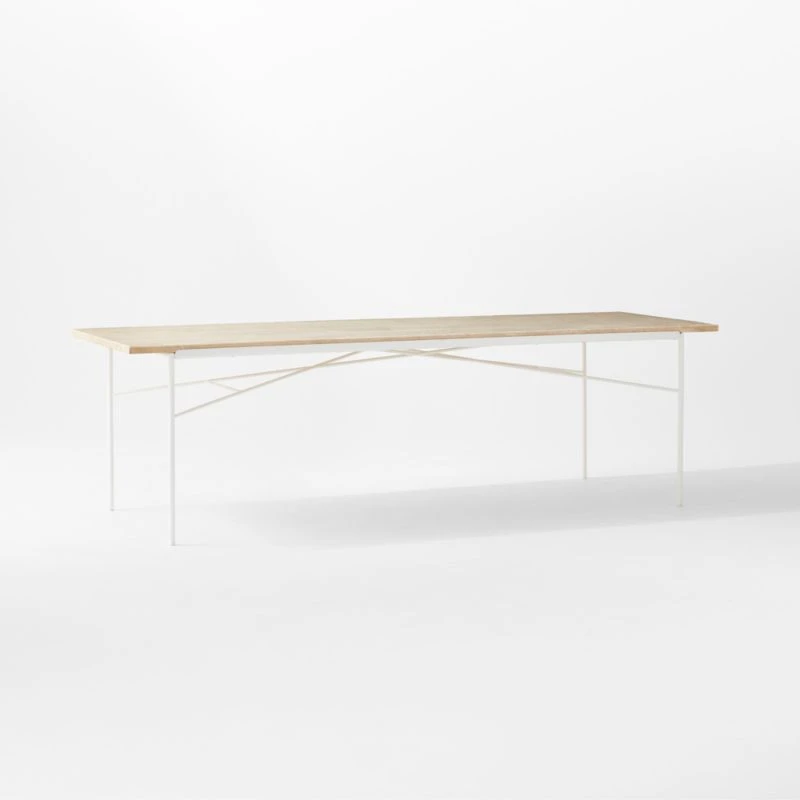 First introduced as part of the Aerial Dining Group in Paul McCobb’s 1952 Pavilion Collection, this large dining table was designed to be durable, beautiful and easy to care for. Natural travertine top contrasts with the modernity of a solid satin ivory iron frame. The Pavilion Collection was featured in the June 1953 issue of House & Garden magazine in an original McCobb illustration, yet doesn’t feel at all out of place in a modern outdoor space or even an indoor dining room. CB2 exclusive.