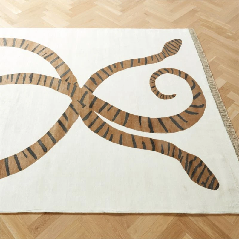 Designed by fashion-designer-turned-home-designer Brett Beldock, three snakes intertwine in tonal neutrals on this modern statement rug. Guided by her unique sense of style, Beldock’s fashion-forward design is printed by hand on viscose yarn to give it a soft, silky feel underfoot. Handloomed and finished with fringe, luxe rug is ideal for low-traffic areas. CB2 exclusive.