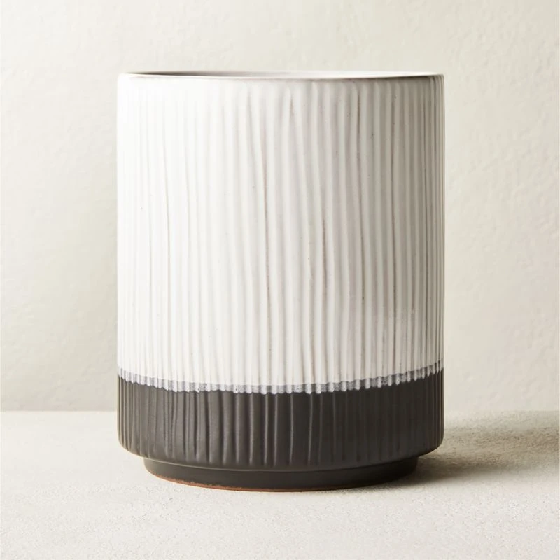 Black and white terracotta utensil holder is large enough to hold all manner of kitchen tools with ease. First, the utensil holder is glazed in matte white, then the bottom is dipped in black and the top is finished with an etched striped design for a unique and handmade look. CB2 exclusive.