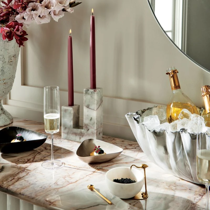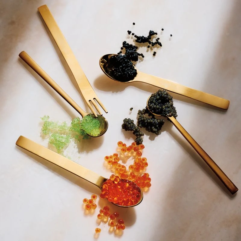 Party smart itsy spoons in 18/8 brushed gold stainless steel with polished bowls. Flat modern shape with great heft dishes out condiments or stirs a strong espresso. Matching cocktail spreaders/forks available.