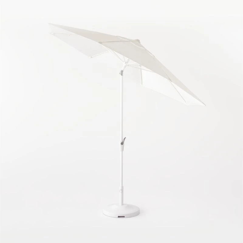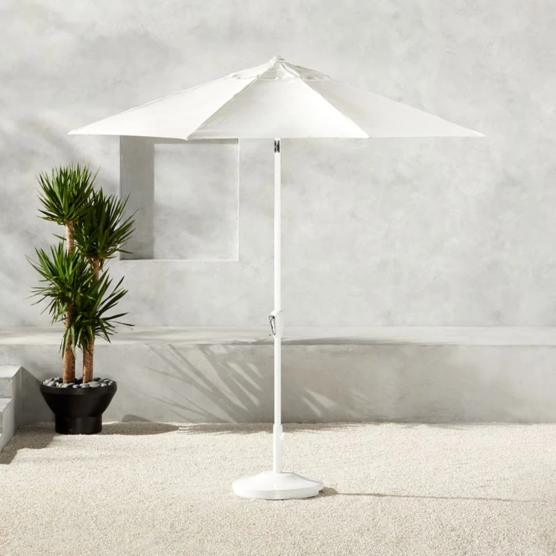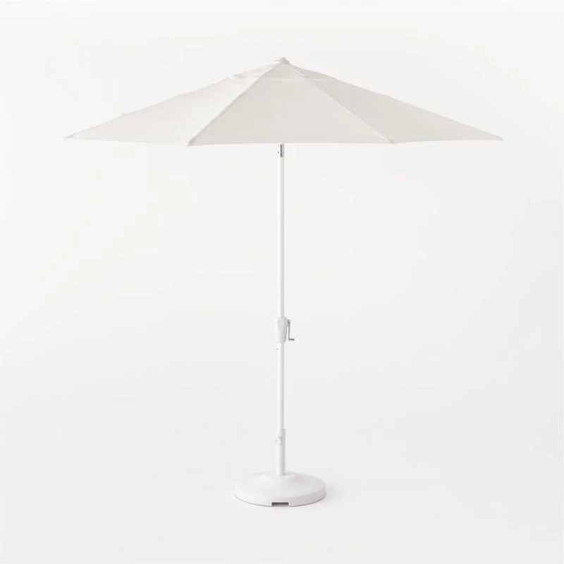 Pop open a modern shade in clean, bright white. Black powdercoated steel pole/fittings are rust-resistant. Spun polyester umbrella shade can raise, lower and tilt with a simple crank. Base has built-in wheels for easy maneuverability. CB2 exclusive.