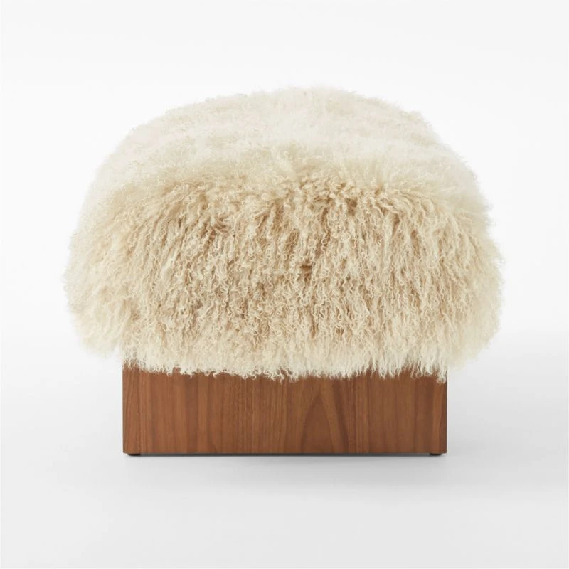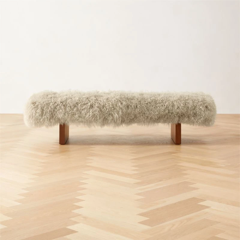 Long bench begins with a base of warm walnut wood, certified sustainable by the Forest Stewardship Council ® (FSC), and is topped by a fluffy overflow of humanely sourced taupe Mongolian sheepskin for incredibly plush comfort. Designed by Gonçalo Campos, bench adds incomparable texture to the entryway, bedroom or living room. CB2 exclusive.