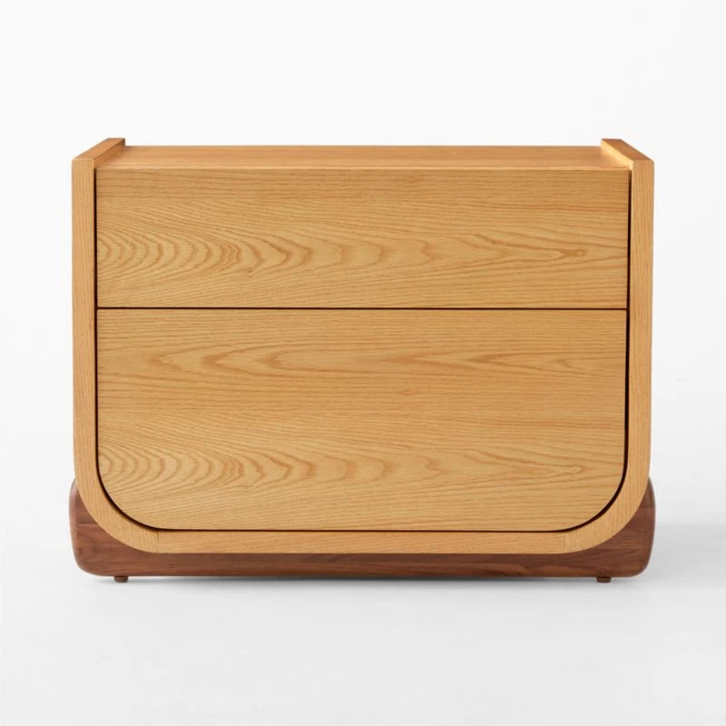 Nightstand by Jannis Ellenberger plays up tonal differences in two types of wood. Natural oak veneer frame is set off by high-gloss walnut legs at its curved base. Two spacious push-to-open drawers have soft-close glides for a premium feel that extends throughout the Stivale bedroom collection. CB2 exclusive.