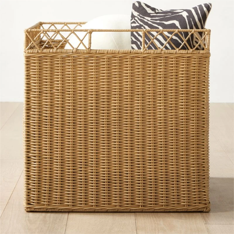 Crafted from natural rattan woven over an iron frame, basket by Ross Cassidy has a classic silhouette and handle smartly incorporated into the design. Simple profile brings a refined sensibility to the porch or patio, offering ample room to store pillows, throws and other outdoor accessories. CB2 exclusive.