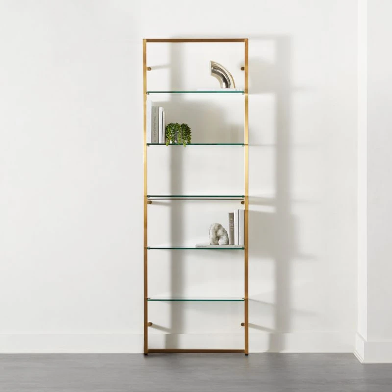 Brass bookcase designed by Mark Daniel of Slate Design draws inspo from the flashier vintage design of the ’50s and anchors it into a sleek, minimalist piece of wall art. Five shelves of tempered glass are fixed to a brushed metal frame and create major drama when repeated down the wall. Stud mounting recommended; hardware included for drywall installation. Learn about Mark Daniel on our blog. CB2 exclusive.