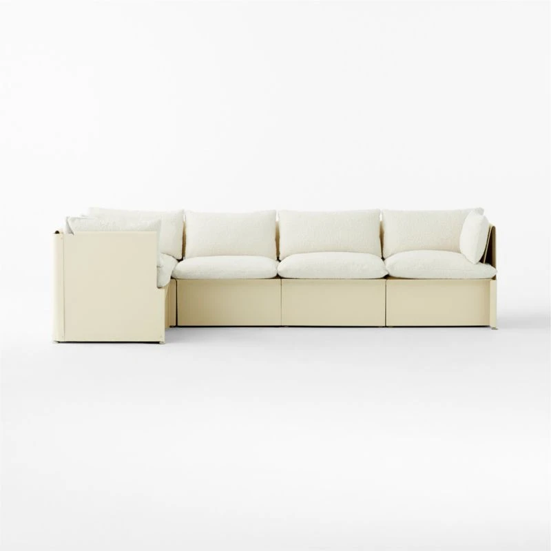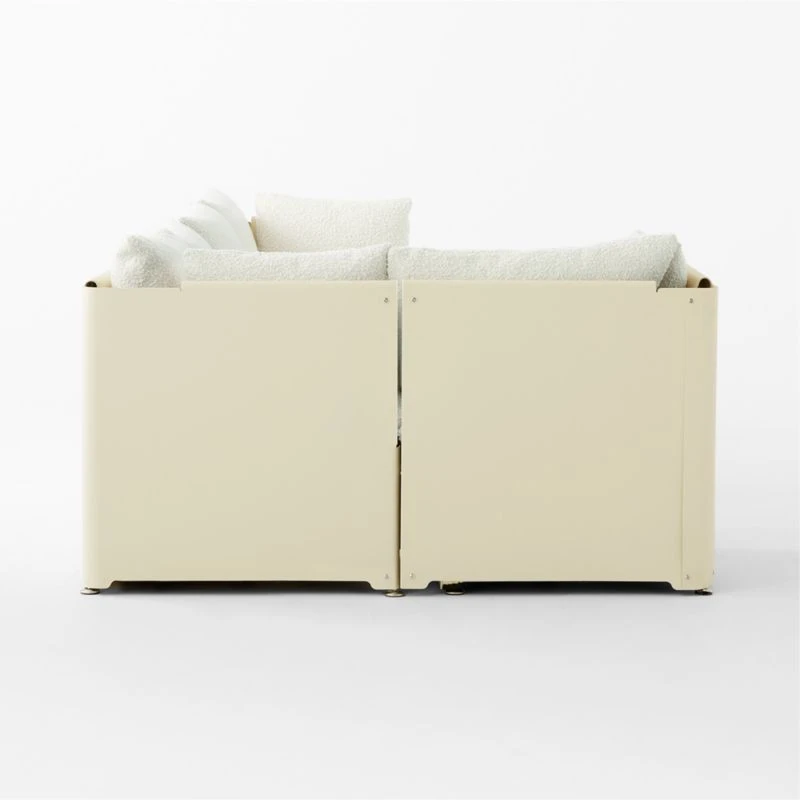 Reminiscent of the substantial furniture commonly found in Caribbean homes, sectional sofa by Axel Mert features a modern powder-coated iron frame in lieu of traditional wood. Defying expectations of material pairings, it explores the contrast between rigidity and plushness with ivory boucle cushions and pillows. All in all, a distinctive, storied and thoroughly contemporary silhouette. CB2 exclusive.