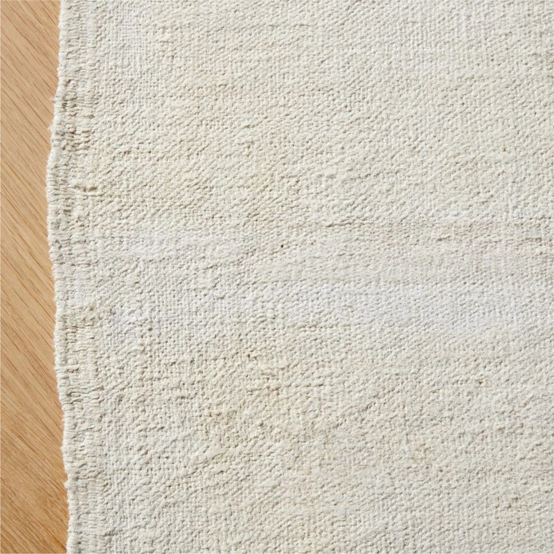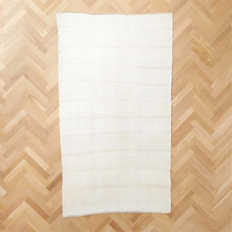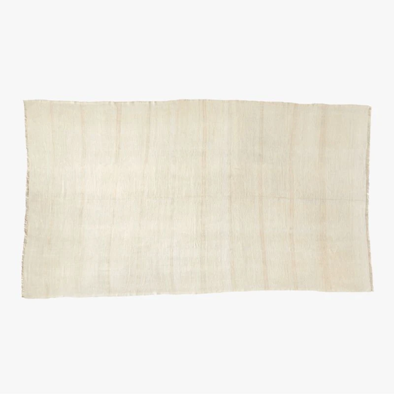 Sourced from the city of Isparta in western Turkey, once the most important carpet producing region of the Ottoman Empire. This one-of-a-kind vintage rug was double hand-knotted decades ago by artisans. Pure hemp rug features organic edges with subtle tone-on-tone stripes throughout. Washed ivory edged in 1″ fringe.