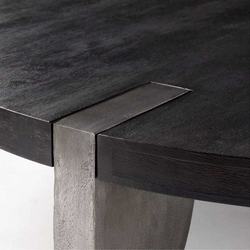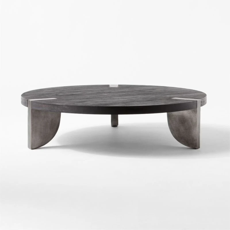 Deco-inspired coffee table by VUUE is a testament to simplicity. Circular top is supported by cast aluminum quarter-circle legs with an antique finish. Legs fit within hand-carved cutouts in the wooden tops. Wirebrushed for texture, acacia wood top is further enhanced by black stain and light lacquer. CB2 exclusive.